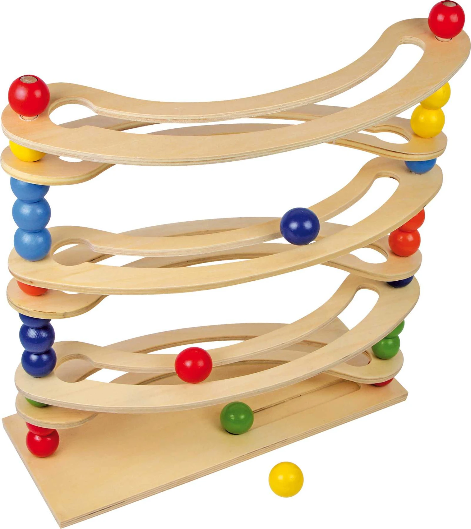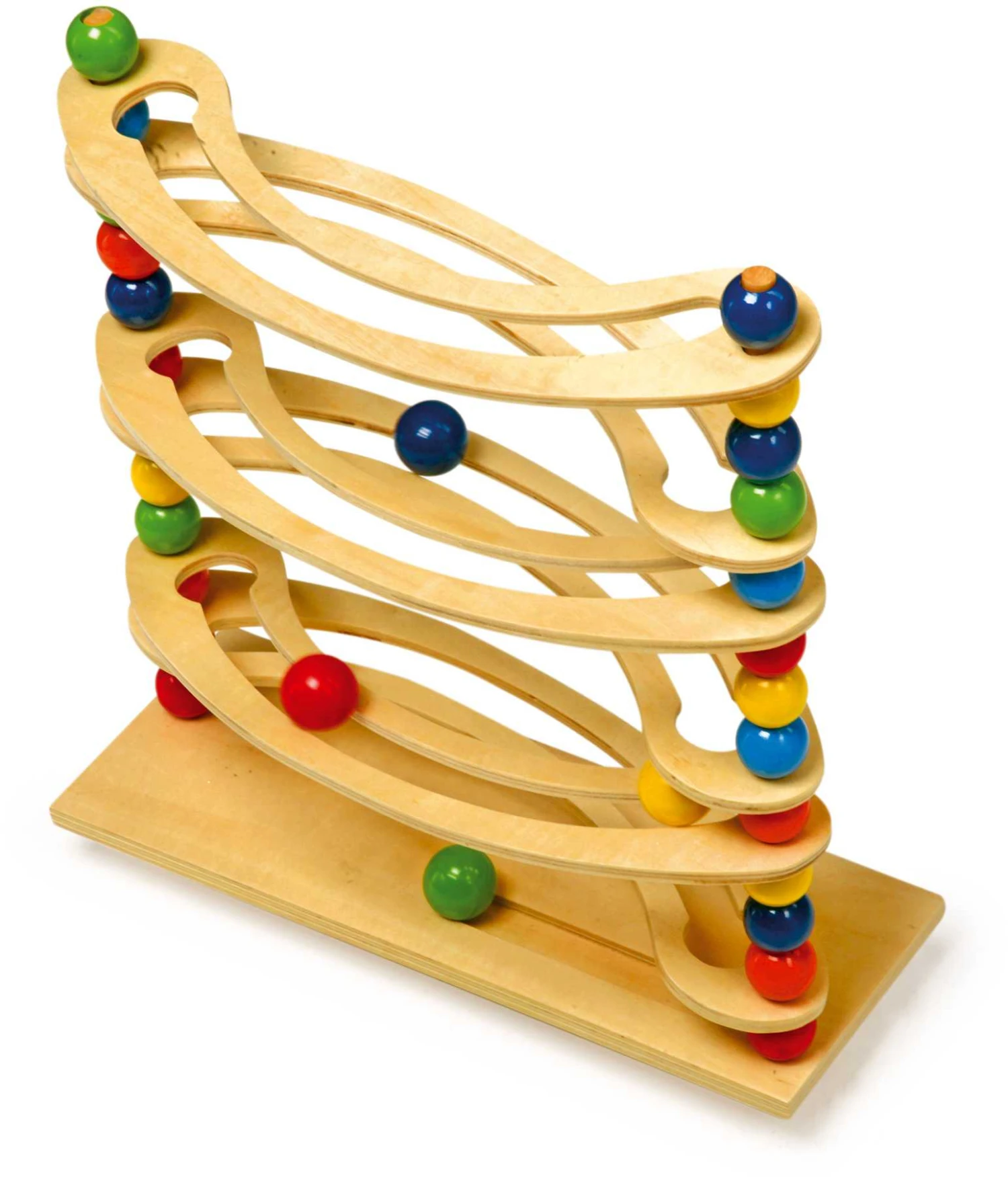 Les boules colorées permettent de choisir le tracé du circuit de billes. Parfois abrupt et parfois plat, ce qui influence aussi la vitesse des billes.