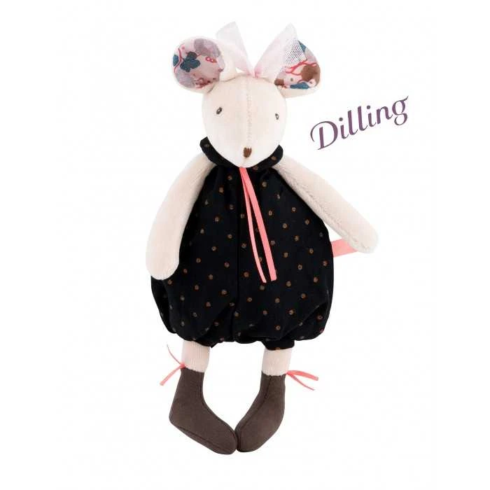 Jolie petite souris hochet idéale pour les petites mains. Cette apprentie magicienne est coiffée d’un nud en tulle et vêtue d’un bloomer avec col Claudine en voile de coton noir à pois dorés. Un jouet facile à manipuler et qui permet de créer une interaction entre bébé et les parents.