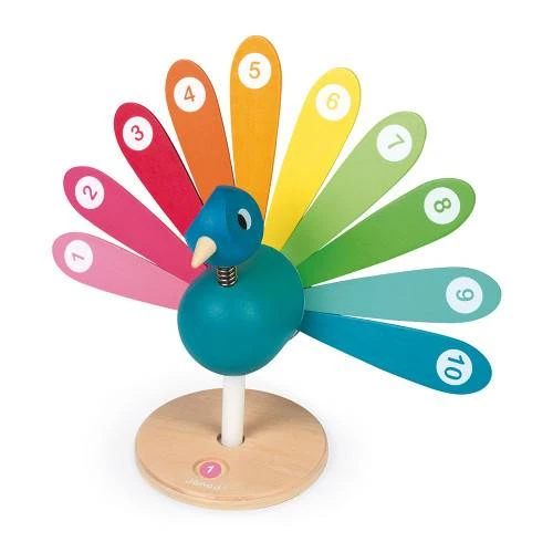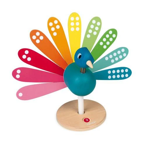 Un joli paon coloré pour apprendre les chiffres ! Le socle tourne pour s’arrêter aléatoirement sur un chiffre. L’enfant va ensuite essayer de retrouver la plume correspondant à ce chiffre sur le paon et la lui retirer. Les plumes sont recto-verso pour jouer avec 3 niveaux de difficulté : retrouver les couleurs, les chiffres et compter les points.