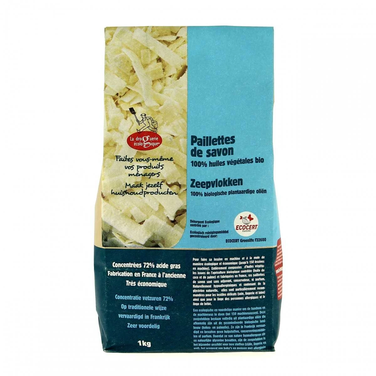 Paillettes de savon végétales bio pour faire sa lessive écolo du linge, 1Kg.