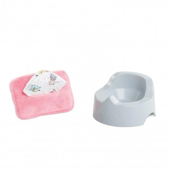 1 pot en plastique, 1 étui à lingette et 1 lingette en tissu. Pour poupon de 30 cm.